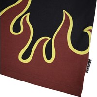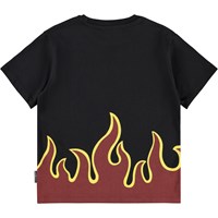 Sort t-shirt i blødt økologisk bomuld med korte ærmer og ribkant i halsen. T-shirten har en løs pasform med et flamme print i bunden i bordeaux og gule farver.