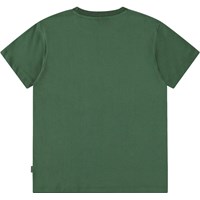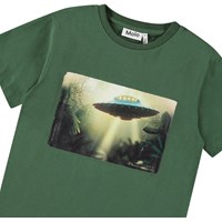 Mørkegrøn t-shirt i blødt økologisk bomuld med korte ærmer og ribkant i halsen. T-shirten har en løs pasform med et frontprint af en UFO i junglen og solens flotte skær.