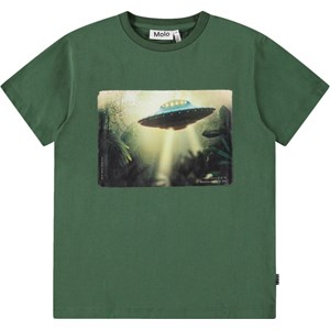 Mørkegrøn t-shirt i blødt økologisk bomuld med korte ærmer og ribkant i halsen. T-shirten har en løs pasform med et frontprint af en UFO i junglen og solens flotte skær.