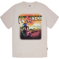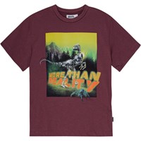 Bordeaux t-shirt i økologisk bomuld med korte ærmer, rund halsudskæring og ribkant i halsen. T-shirten har en løs pasform og et placeret print på fronten. På printet møder fortid og fremtid hinanden i form af en robot-dinosaur, der søger efter venner i skoven. Teksten "More Than Reality" står skrevet i bunden og er næsten på vej ud af billedet.