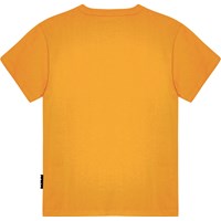 Orange t-shirt i økologisk bomuld med korte ærmer, rund halsudskæring og ribkant i halsen. T-shirten har en løs pasform og har et multifarvet placement print af to dinosaurer, der leger fangeleg med en UFO.