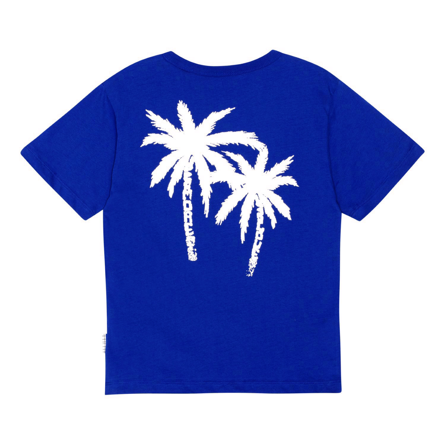 Blå t-shirt i økologisk bomuld. På fronten er der et lille hvidt palmeprint, som bliver gentaget i stor på ryggen. Og ser du godt efter, kan du måske finde et skjult budskab om 'More Love'. T-shirten har en rund halsudskæring, ribkant i halsen og en løs pasform.