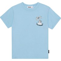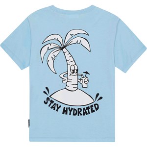 Lyseblå t-shirt med placementprint på front og ryg i økologisk bomuld. På printet ses en comic-style palme, der står på sin egen lille ø og nyder en kølig drink. Den spreder budskabet om at "Stay Hydrated" og hvor vigtigt det er for både mennesker og for naturen, at få masser af vand. T-shirten har en rund halsudskæring, ribkant i halsen, print på fronten og en løs pasform.