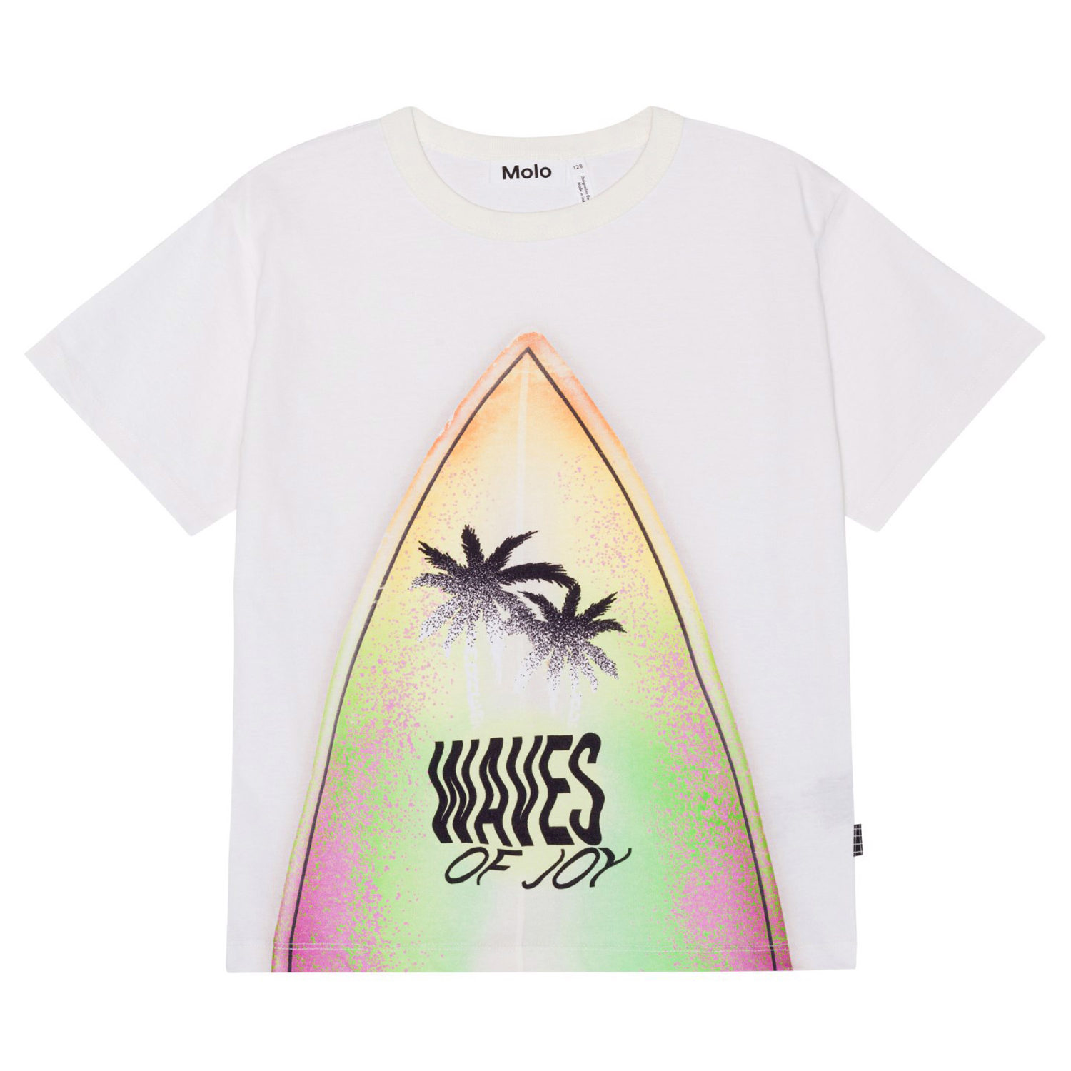 Hvid t-shirt med et placeret frontprint i økologisk bomuld. Printet er toppen af et surfboard, spraymalet i farverne lilla, limegrøn og gul, en palme og teksten"Waves of Joy". T-shirten har en rund halsudskæring, ribkant i halsen og en løs pasform.