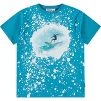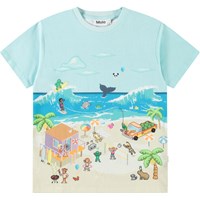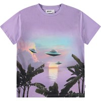 Beige t-shirt i blødt økologisk bomuld med korte ærmer og ribkant i halsen. T-shirten har en løs pasform med et frontprint af en UFO i junglen og solens flotte stråler.