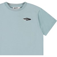 Lyseblå t-shirt i blødt økologisk bomuld med korte ærmer og ribkant i halsen. T-shirten har en løs pasform med et sort/hvidt frontprint af flyvende ufoer.