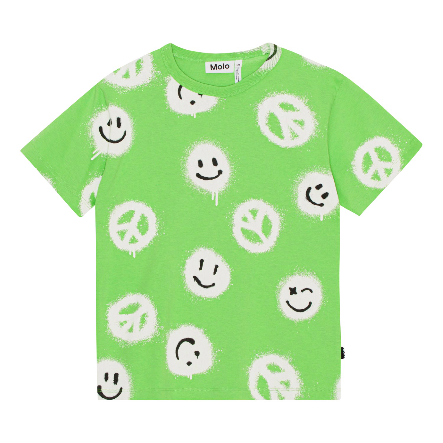 Grøn t-shirt med hvidt og sort alloverprint i økologisk bomuld. Alloverprintet består af en masse spraymalede peacetegn og smilende ansigter, som sammen spreder budskabet om 'More Love'. T-shirten har en rund halsudskæring, ribkant i halsen og en løs pasform.