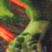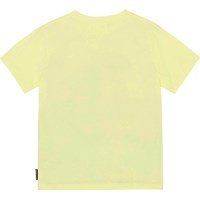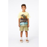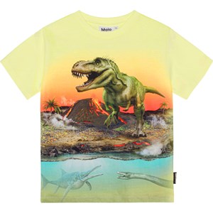 Gul t-shirt med et placement frontprint i økologisk bomuld. Printet viser en Tyrannosaurus rex, der vandrer omkring i et hedt vulkanlandskab med lava og damp, der stiger op fra jorden. I vandet i forgrunden gemmer to havøgler sig i sikkerhed i det kølige vand. T-shirten har en rund halsudskæring, ribkant i halsen og en løs pasform.