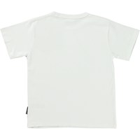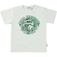 Riley er en hvid t-shirt i økologisk bomuld, med et grønt dinosaur print placeret midt på forsiden.