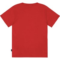 Rød t-shirt i økologisk bomuld med korte ærmer, rund halsudskæring og ribkant i halsen. T-shirten har en løs pasform og et placeret sort/hvidt print på fronten. Printet består af teksten "World Play".