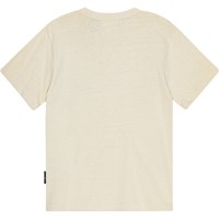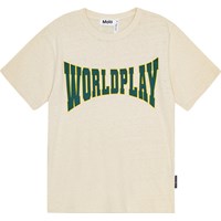 Råhvid t-shirt i økologisk bomuld med korte ærmer, rund halsudskæring og ribkant i halsen. T-shirten har en løs pasform og et mørkegrønt og gult print på fronten af teksten "World Play".