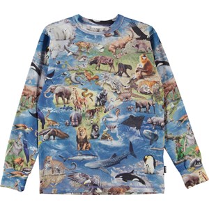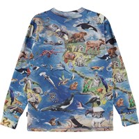 Rill er en blå, langærmet t-shirt med print af vores jordklodes kontinenter, og alle de dyr, som lever både i vand og på land.