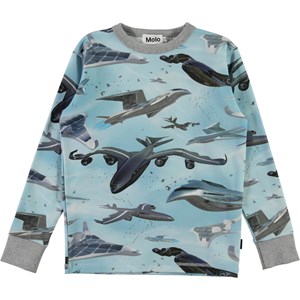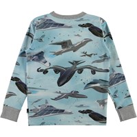 Rill er en langærmet lyseblå t-shirt med print af fly. Rill har lysegrå kantbånd ved halsudskæringen og ærmerne.