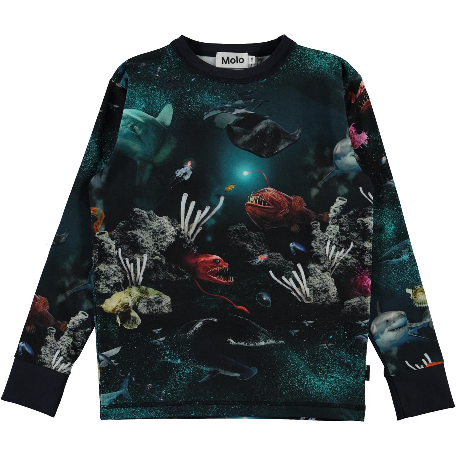 Dyk ned under havets overflade og se hvad der gemmer sig i printet på blusen Rill. Der er mange forskellige fisk og måske du også kan spotte en haj. Rill er en langærmet blå t-shirt med mørkeblå kantbånd ved halsudskæringen og ærmerne.