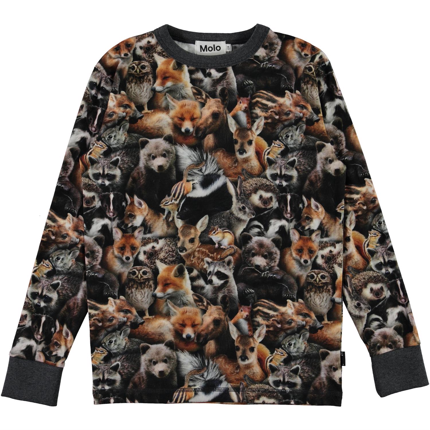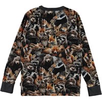 Rill er en langærmet t-shirt med all-over print af skovens dyr samlet. Kan du finde bjørnene og pindsvinene eller måske et dyr, som du ikke kender? Rill har mørkegrå kantbånd ved halsudskæringen og ærmerne.