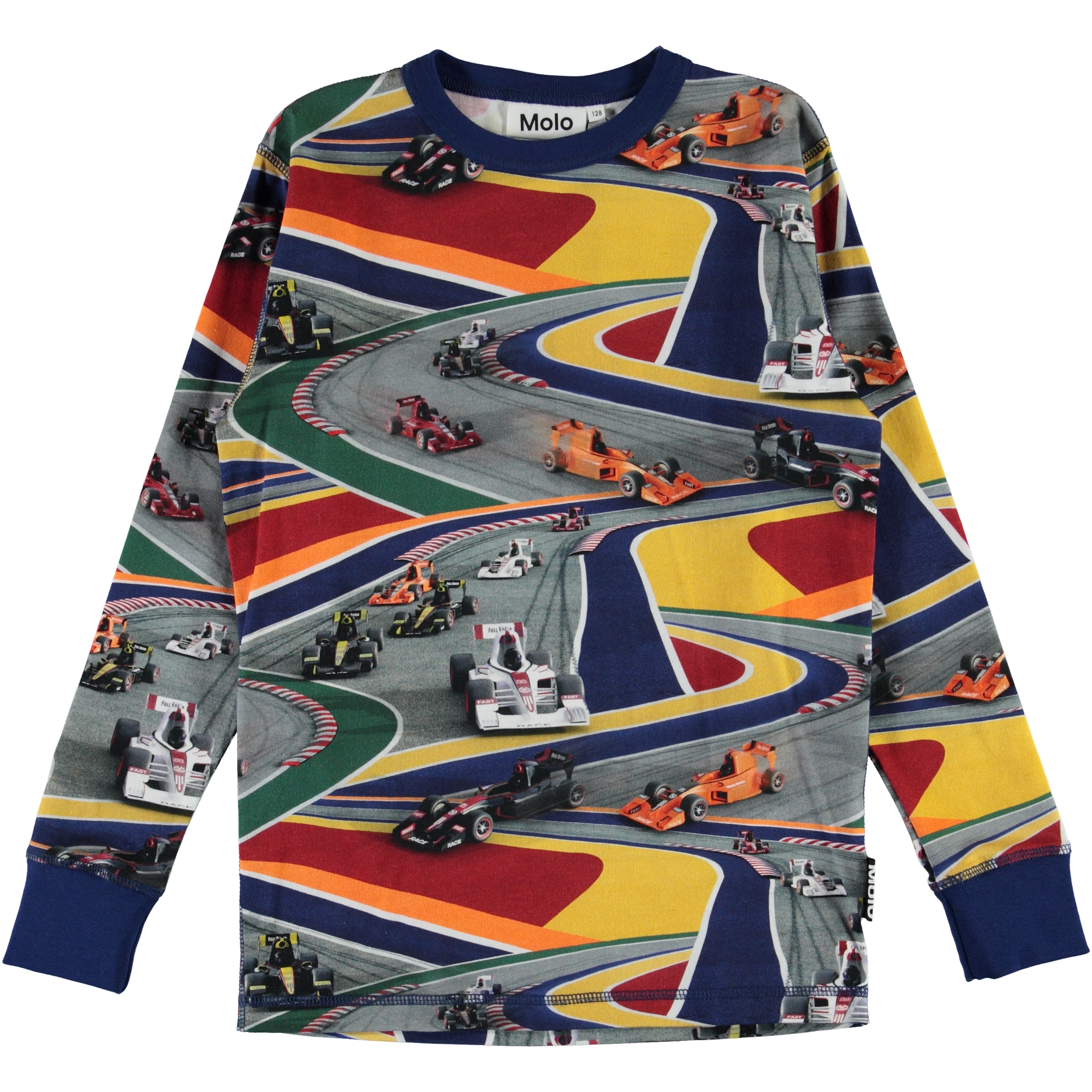 Rill er en langærmet t-shirt med farverigt all-over print af hurtige racerbiler. Rill har blå kantbånd ved halsudskæringen, samt blå ribkant ved ærmerne.