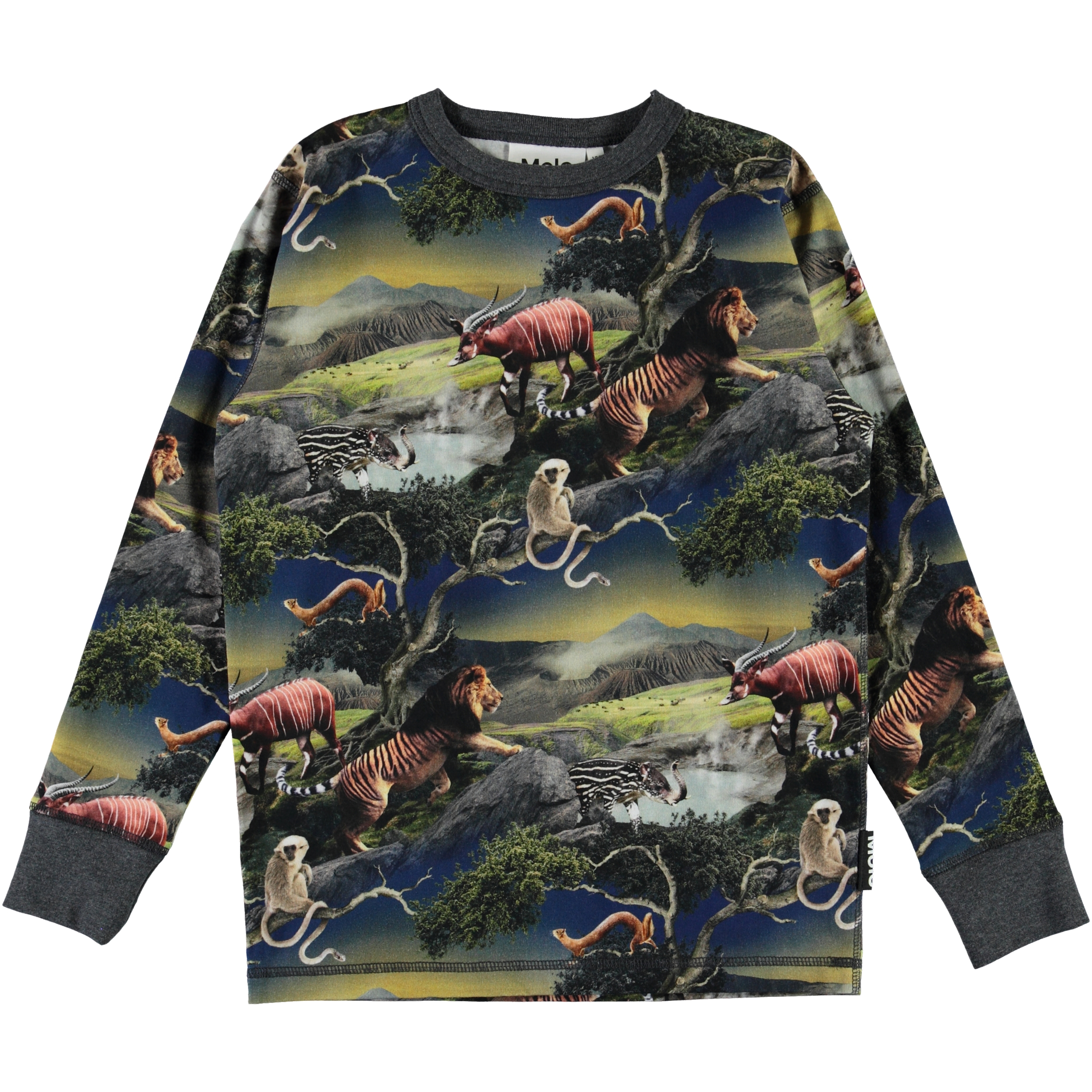 På den langærmede t-shirt Rill er vi rejst frem i tiden med printet 'Future Animals', hvor dyrene ikke længere ligner helt sig selv. Rill har mørkegrå kantbånd ved halsudskæringen, samt mørkegrå ribkant ved ærmerne.
