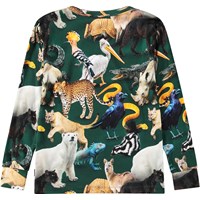 Multifarvet bluse i økologisk bomuld med lange ærmer, ribkant og rib i halsen. Blusen har en almindelig pasform og et alloverprint af en masse forskellige dyr på en grøn baggrund.