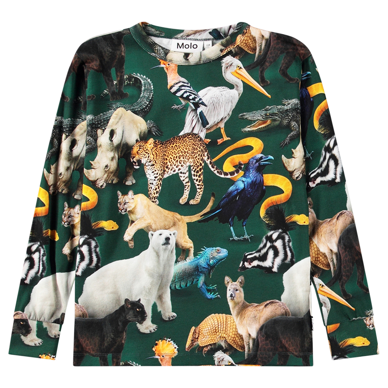 Multifarvet bluse i økologisk bomuld med lange ærmer, ribkant og rib i halsen. Blusen har en almindelig pasform og et alloverprint af en masse forskellige dyr på en grøn baggrund.