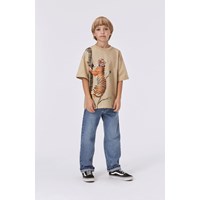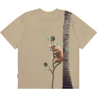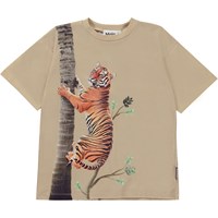 Beige t-shirt med et front print af en klatrende tiger. På bagsiden er et lille jungledyr ved at kravle op i en mindre træ - den gemmer sig nok for tigeren. Denne t-shirt er fremstillet i 100% økologisk bomuld, har korte ærmer, rund halsudskæring med ribkant, samt et loose fit.