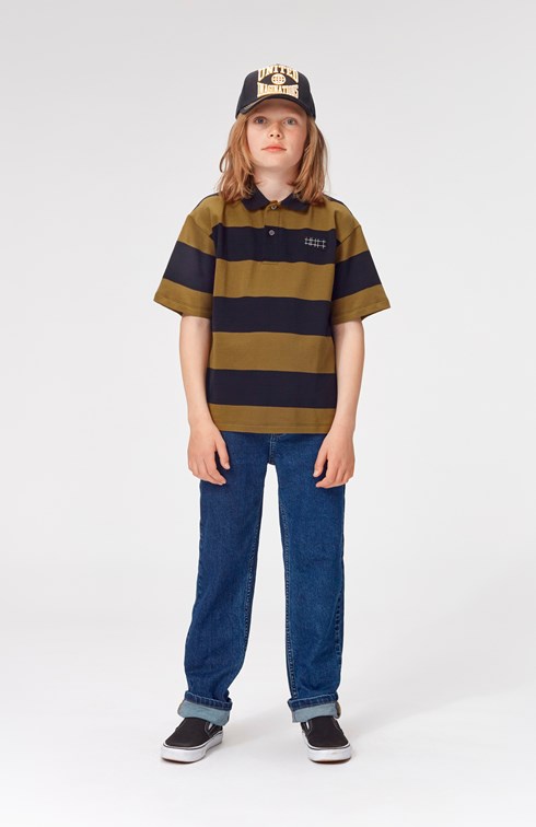 Rilloz er en polo T-shirt med sort krave og brede striber i brun og sort.