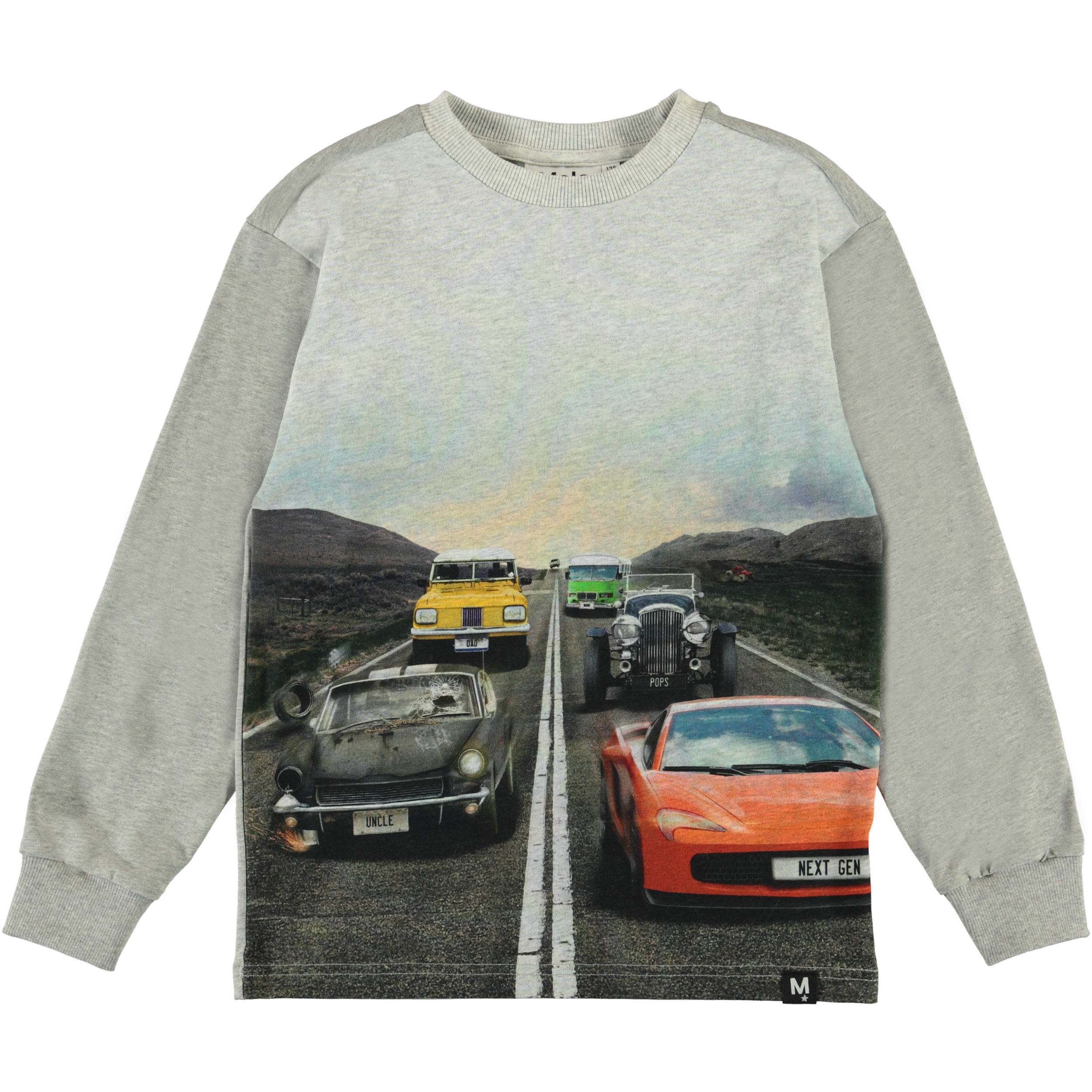 Bilerne har også en familie og mange af medlemmerne er samlet her på blusen Risci. Blusen er i glå bomuld og har lange ærmer.