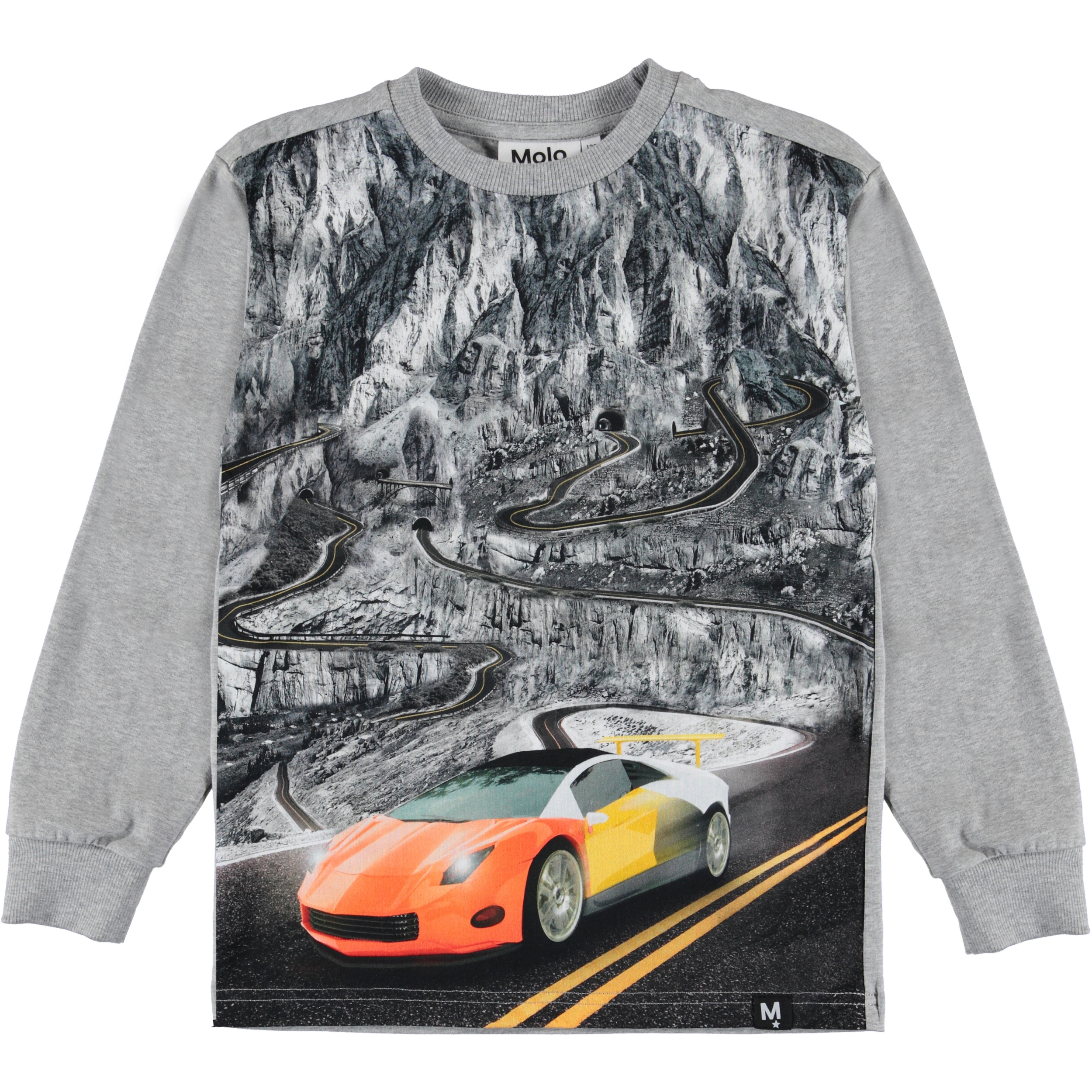 Det går stærkt på blusen Risci, når bilen drøner gennem små snoede veje på printet 'Patchwork Car'. Blusen er i glå bomuld og har lange ærmer.