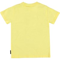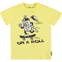 Road er en gul T-shirt med et print af en spraydåse på skateboard i fuld fart. Denne Molo vare er fremstillet i certificeret økologisk bomuld.