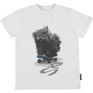 På den hvide t-shirt Road i printet "Dog on a Roll", er det om at komme af vejen for hunden, der ræser afsted på skateboardet.