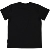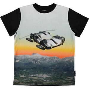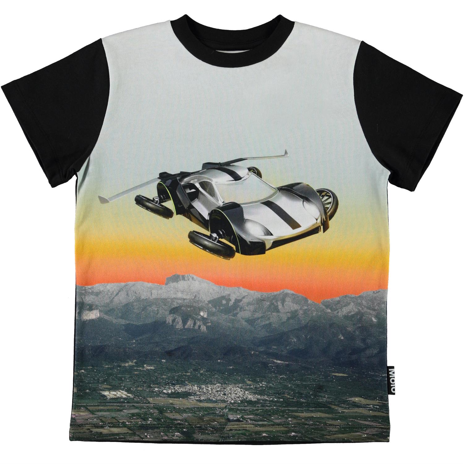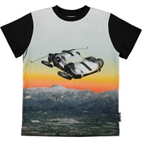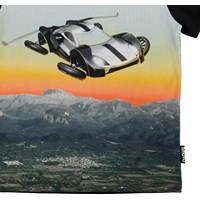 Road er sort t-shirt med print af svævebil fra fremtiden, som flyver over landskabet og solnedgangen.