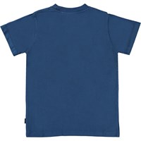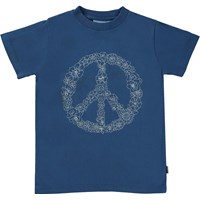 Road er en mørkeblå t-shirt med print af et grønt peacetegn på forsiden. Kigger man lidt tættere på, kan man se at peacetegnet er dannet af en masse små glade blomster.
