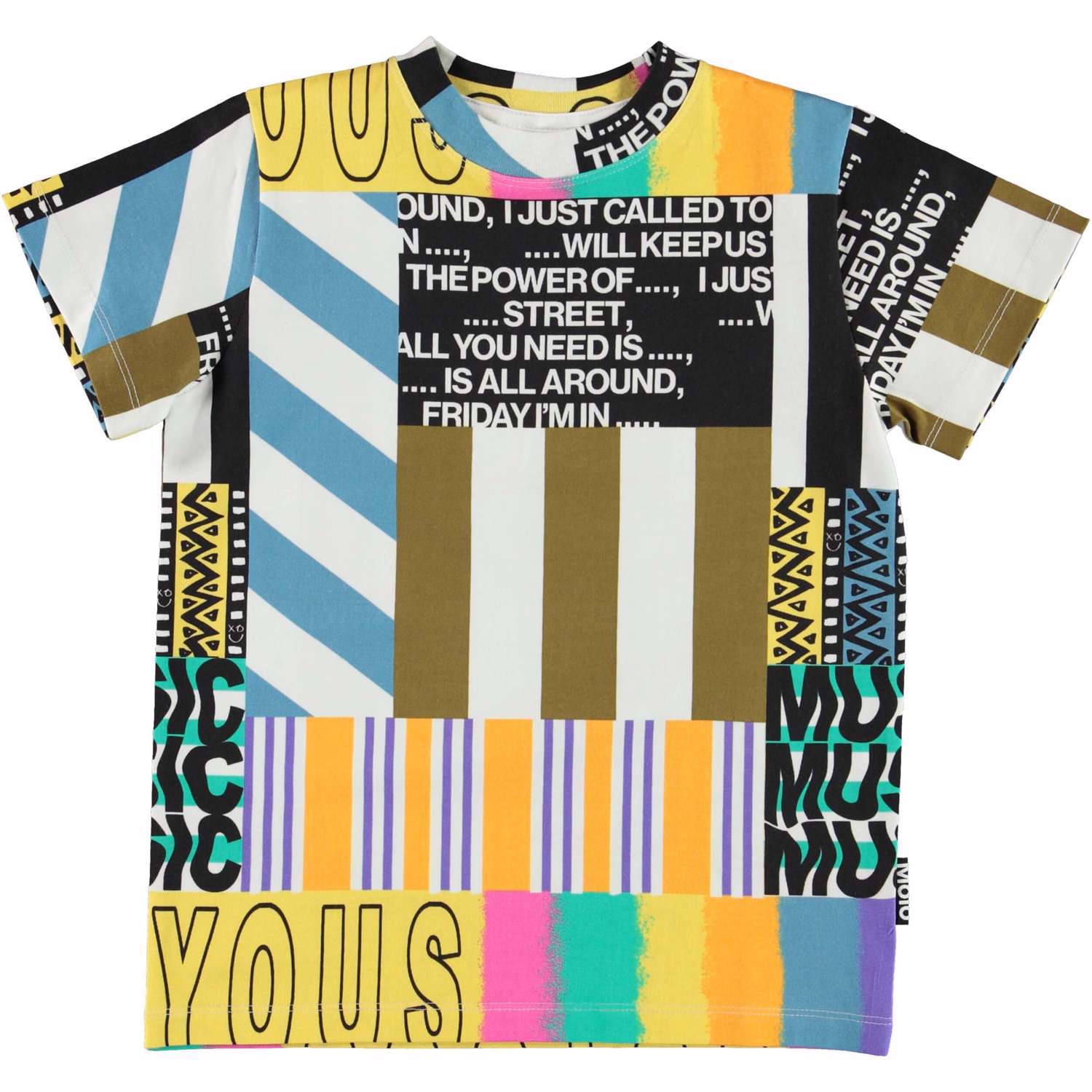 Road er en T-shirt i printet "Print Work". På printet ses en collage af forskellige mønstre, citater og slogans.