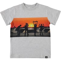 Road er en grå t-shirt med print af solnedgang og en gruppe af skateboardere. Road er i 100% bomuld og har korte ærmer.