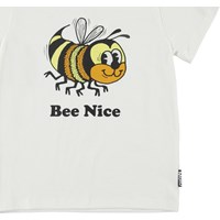 Road er en hvid t-shirt med print af en bi på fronten og teksten 'Bee nice'.