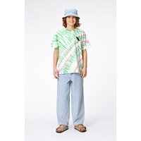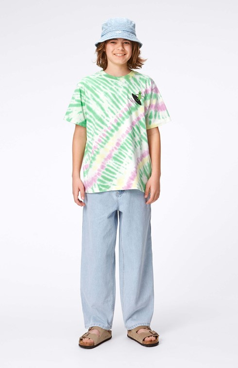 T-shirt med tie-dye print, i hvid/grøn/lilla i økologisk bomuld. På fronten ses et placementprint i sort og grøn, med en lille glad alien på et surfbræt. T-shirten har en rund halsudskæring, ribkant i halsen og et oversize fit.