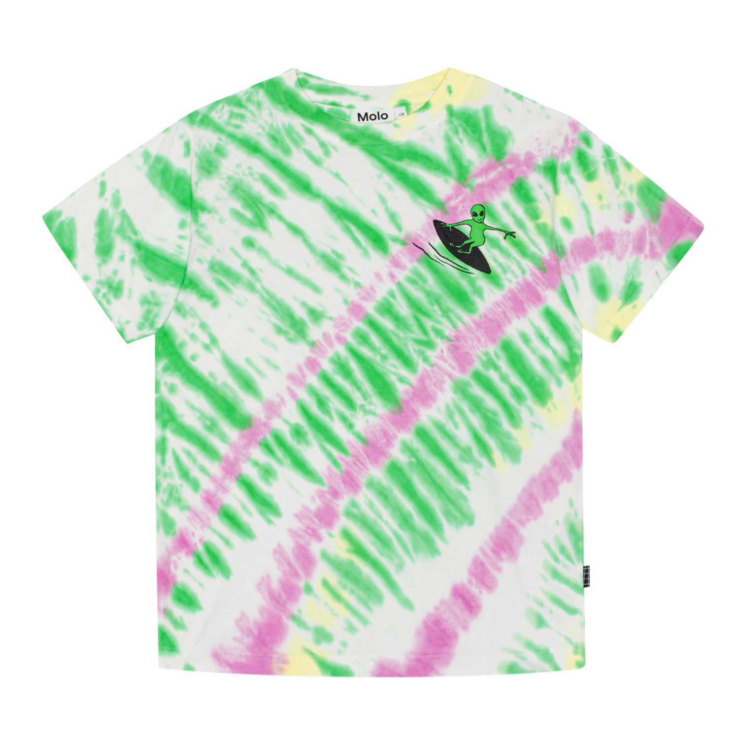 T-shirt med tie-dye print, i hvid/grøn/lilla i økologisk bomuld. På fronten ses et placementprint i sort og grøn, med en lille glad alien på et surfbræt. T-shirten har en rund halsudskæring, ribkant i halsen og et oversize fit.
