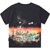 Sort t-shirt i økologisk bomuld med korte ærmer, rund halsudskæring og ribkant. T-shirten har en oversized pasform og et placeret print på både front og ryg, der består af et farverigt og fantastisk virvar af vilde dyr, racerbiler, dinosaurer, UFO'er og alverdens fantasifulde væsener.