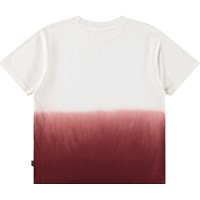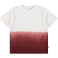 Hvid t-shirt i økologisk bomuld med korte ærmer og ribkant i halsen. T-shirten har en løs pasform med et bordeaux tie-dye døb i bunden.