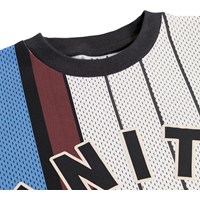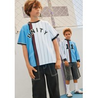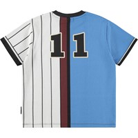 Blå og hvid t-shirt i økologisk bomuld med korte ærmer og ribkant i halsen. T-shirten har en løs pasform og et sporty basket-inspireret udtryk med tallet 11 på ryggen og teksten 'Unity.