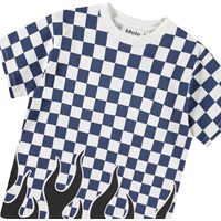 Hvid og blåternet t-shirt i økologisk bomuld med korte ærmer og ribkant i halsen. T-shirten har en løs pasform og et print, der refererer til motocrossverdenen med sorte flammer i bunden.