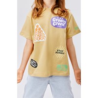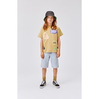 Rodney er en lysebrun t-shirt med print af forskellige "klistermærker" printet både på forsiden, på ærmet og et enkelt printet i nakken.