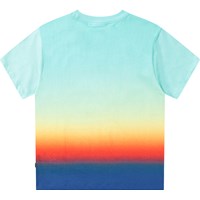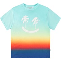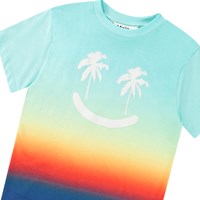 Oversize t-shirt i økologisk bomuld med korte ærmer og ribkant i halsen. T-shirten er regnbuefarvet med et print af smilende palmeansigter på fronten.