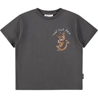 Grå t-shirt i økologisk bomuld med korte ærmer og ribkant i halsen. T-shirten har en løs pasform med et print af en tiger på elguitar.