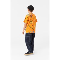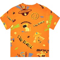 Orange t-shirt i økologisk bomuld med korte ærmer, rund halsudskæring, og ribkant i halsen. T-shirten har en oversized pasform og et alloverprint. Printet består af forskelligt farvede comic-figurer, såsom en alien, der er på udkig efter snacks og beamer bananer op i sin UFO, en kat med en computerskærm som hoved, der kigger på en computermus, og en alien med VR-headset. Et livligt mønster med mange sjove detaljer.