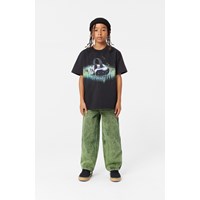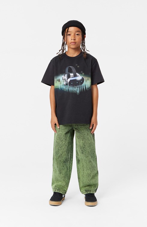 Sort t-shirt i økologisk bomuld med korte ærmer, rund halsudskæring og ribkant i halsen. T-shirten har en oversized pasform og et placeret print på fronten inspireret af virtual reality, især VR-briller, som har evnen til at transportere dig ind i en helt anden verden.