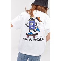 Rodney i det nye "wide fit" er en oversized T-shirt. Her i hvid med et print i stort på ryggen, hvor en spraydåse står på skateboard. Det samme print i lille sidder på brystet i venstre side.