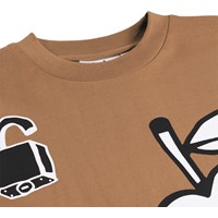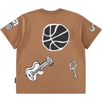 Brun t-shirt i økologisk bomuld med korte ærmer og ribkant i halsen. T-shirten har en løs pasform med sjove sorte og hvide prints.