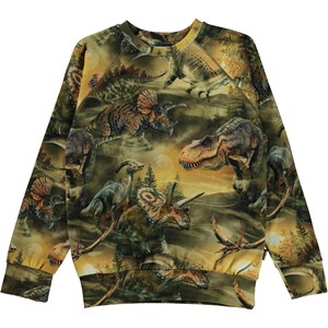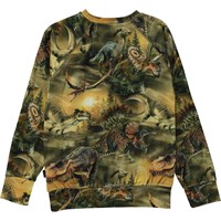 Grøn langærmet t-shirt med allover dinoprint. På printet ses mange forskellige dinosaurer, vandrende rund i sandklitterne, i disen lige før morgengry. Over dem ses omridset at månen, der husker dem på at de er en del af noget større. Denne langærmede t-shirt er fremstillet i 100% økologisk bomuld, har en rund halsudskæring med ribkant, raglansnit, bred ribkant ved ærme og hofte, samt et regulært fit.