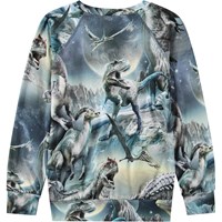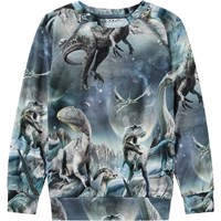 Bluse i blå nuancer i økologisk bomuld med rund halsudskæring, ribkant, raglansnit og bred ribkant ved ærme og hofte. Blusen har en almindelig pasform og et alloverprint, der viser en masse dinosaurer, der bor på deres helt egen planet.