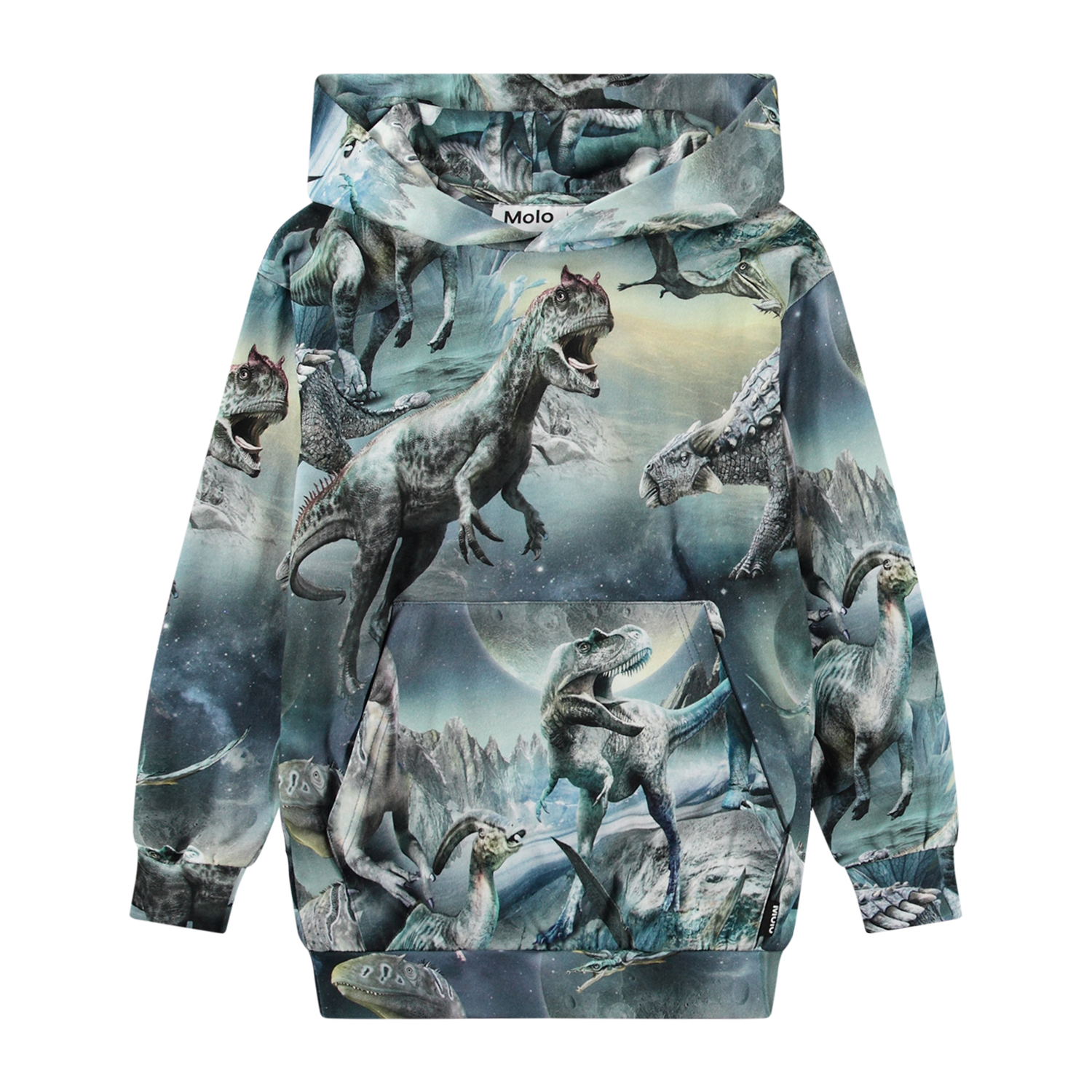 Blå hoodie i økologisk bomuld med lange ærmer, hætte, bred ribkant ved ærme og hofte, og en kængurulomme på fronten. Hoodien har en almindelig pasform og alloverprint. På printet ses en masse dinosaurer, der lever på deres helt egen planet.